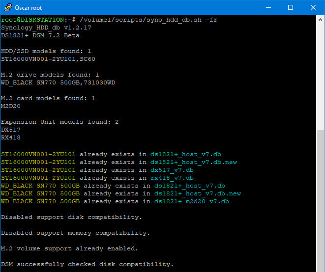 • If you have some Synology drives and want to update their firmware run the script without --noupdate or -n then do the drive database update from Storage Manager and finally run the script again with your preferred options.